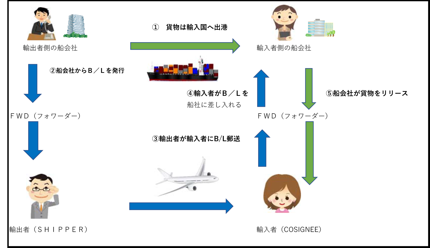 【B/L発行~貨物引きとりまでの流れ】